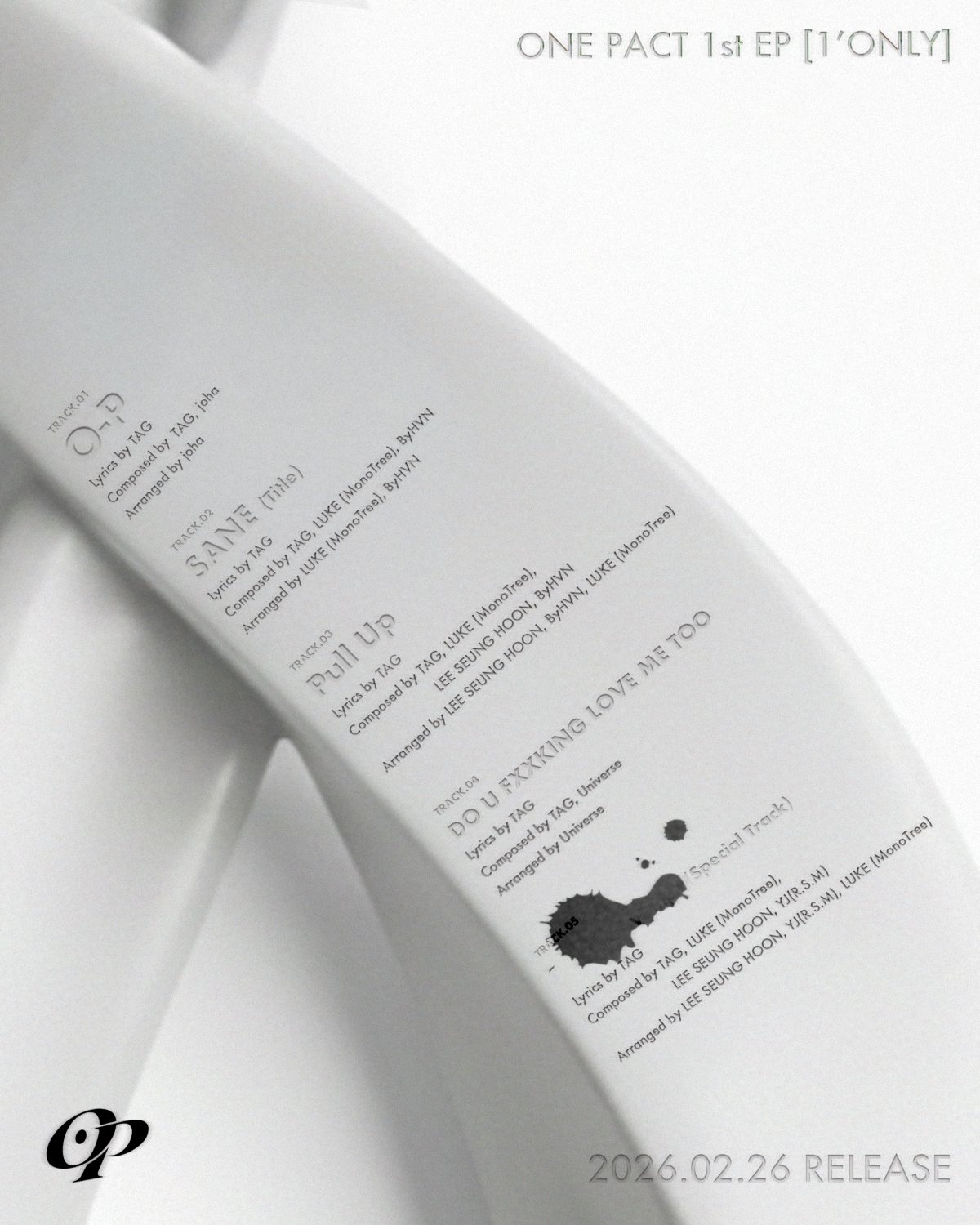 공개된 트랙리스트에 따르면 이번 첫 번째 EP ‘1’ONLY(원앤온리)’에는 ‘O-P’를 시작으로 타이틀곡 ‘SANE(세인)’, ‘Pull Up’, ‘DO U FXXKING LOVE ME TOO, 그리고 스페셜 트랙까지 총 5곡이 수록됐다. 이를 통해 원팩트만의 고유한 서사를 이어갈 전망이다.