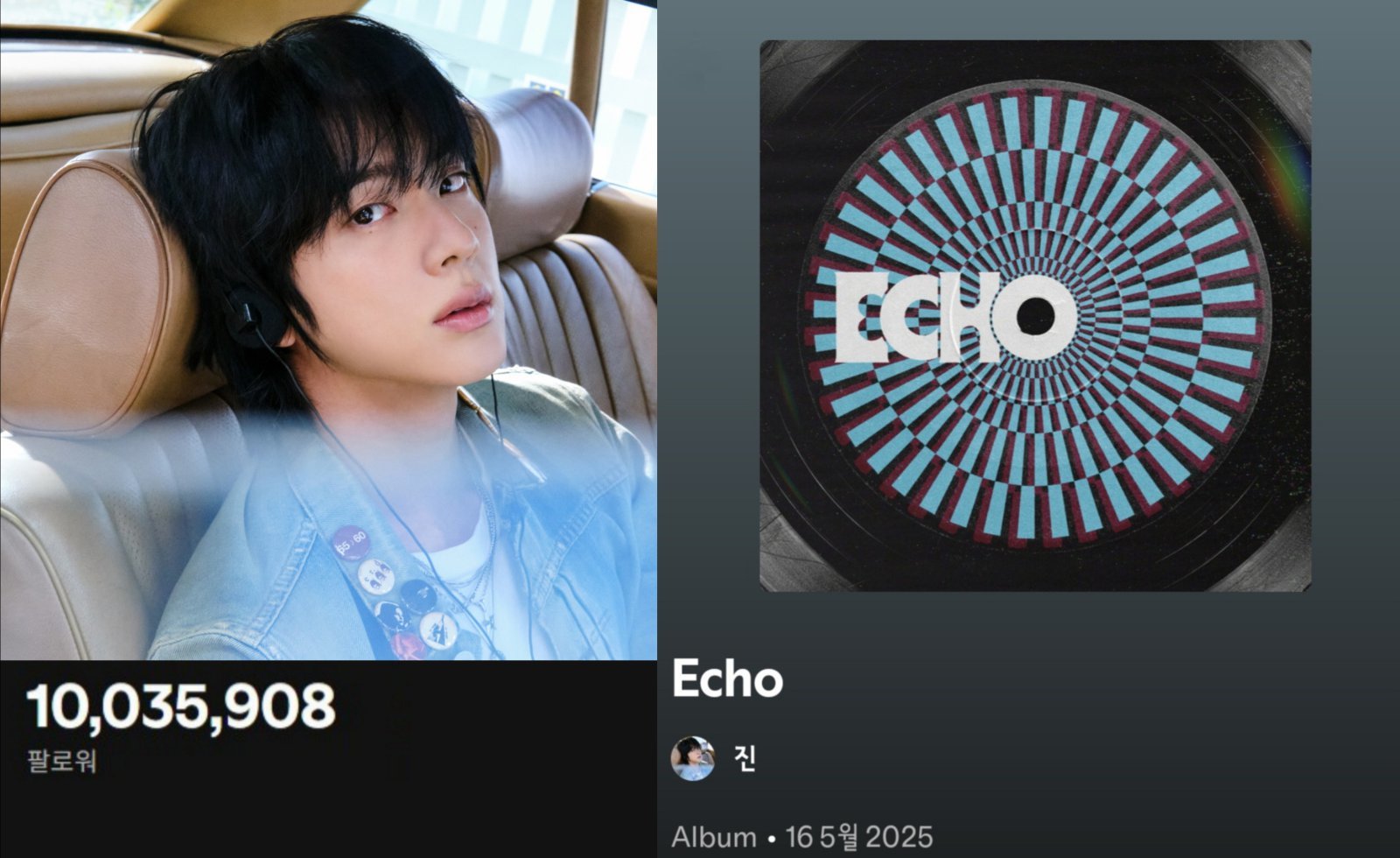 앨범 ‘Echo’ 역시 누적 11억 스트리밍을 넘기며 존재감을 더했다. 타이틀곡을 포함한 수록곡 전반이 고르게 사랑받으며 앨범 단위의 성과로 이어졌다. 다양한 곡 구성 속에서 진은 섬세한 표현력과 안정적인 가창으로 리스너들의 반복 청취를 이끌어냈다.