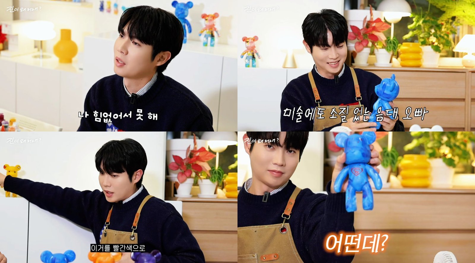 3일 공개된 유튜브 단독 웹 예능 ‘진이 왜 저래’ 베어브릭 페인팅 편에서 손태진은 무지 베어브릭 인형 위에 아크릴 물감을 칠해 자신만의 인테리어 오브제를 완성하는 체험에 나섰다.