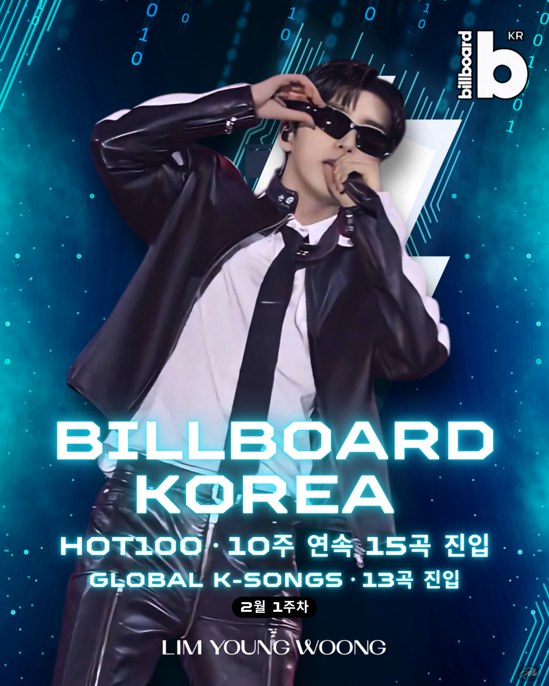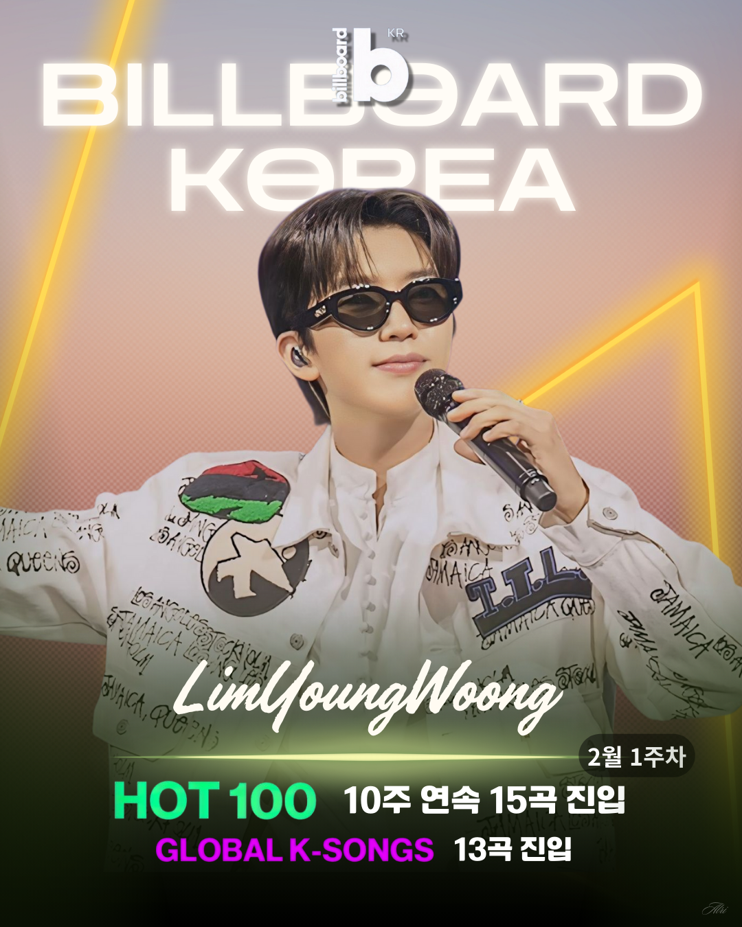 임영웅은 2월 1주차 기준 ‘Billboard Korea Global K-Songs’ 톱100에 13곡, 국내 시장을 반영하는 ‘Billboard Korea Hot 100’에 15곡을 동시에 올리며 두 차트에서 모두 강한 성과를 냈다. 특히 두 차트 모두에서 톱100에 가장 많은 곡을 진입시킨 가수로 기록됐다.