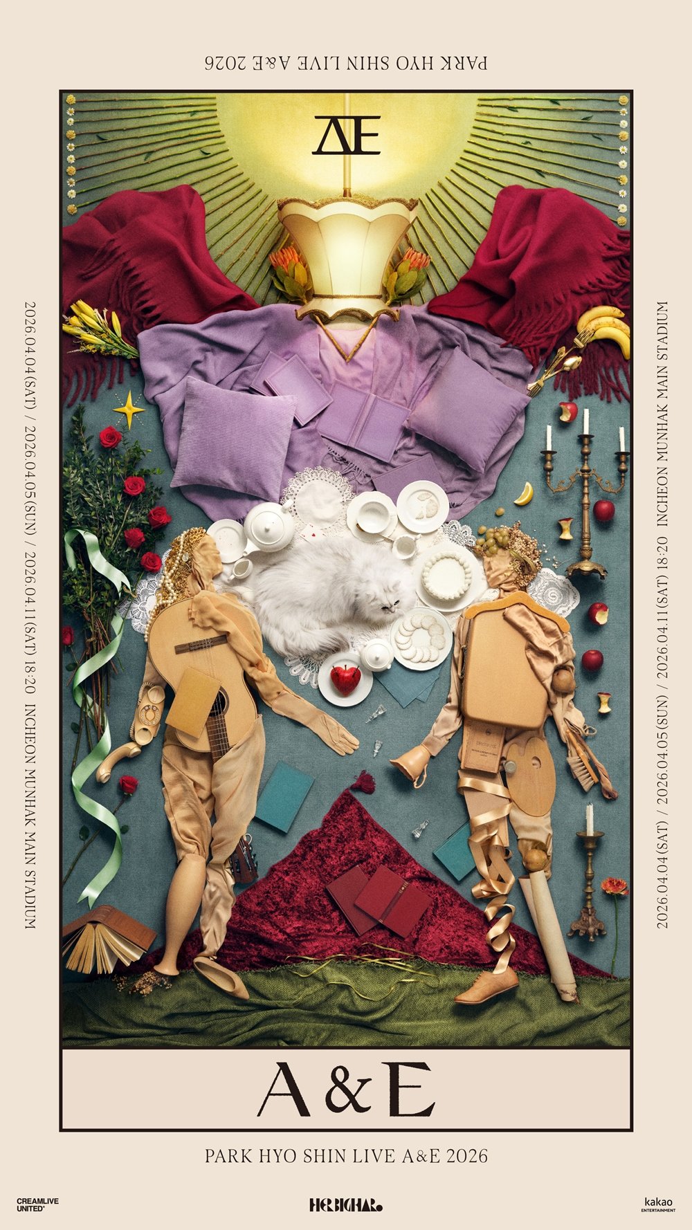 또한 빛나는 태양 아래 서로 마주보고 있는 남녀의 형상은 사람의 모습이지만 전화기, 기타, 솔 등 다양한 사물로 표현해 보는 이의 시선을 사로잡는다. 포스터 위아래로 배치된 ‘A & E’ 문구는 그 의미를 궁금케하며 콘서트에 대한 기대감을 더욱 끌어올린다.