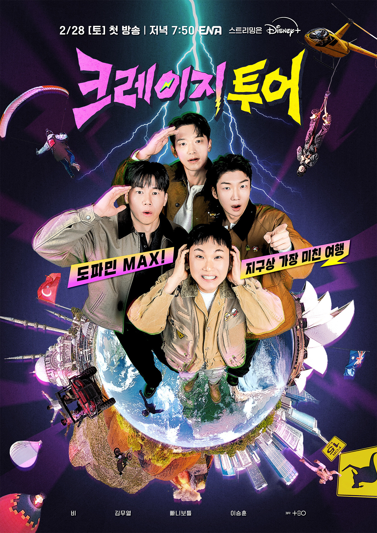 ‘크레이지 투어’는 비(정지훈)·김무열·빠니보틀·이승훈(WINNER) 4인이 전 세계 곳곳의 ‘크레이지’한 도전을 찾아 떠나는 여행 예능으로, 관광과 힐링 대신 카타르시스와 스릴을 전면에 내세운 것이 차별화 포인트다.