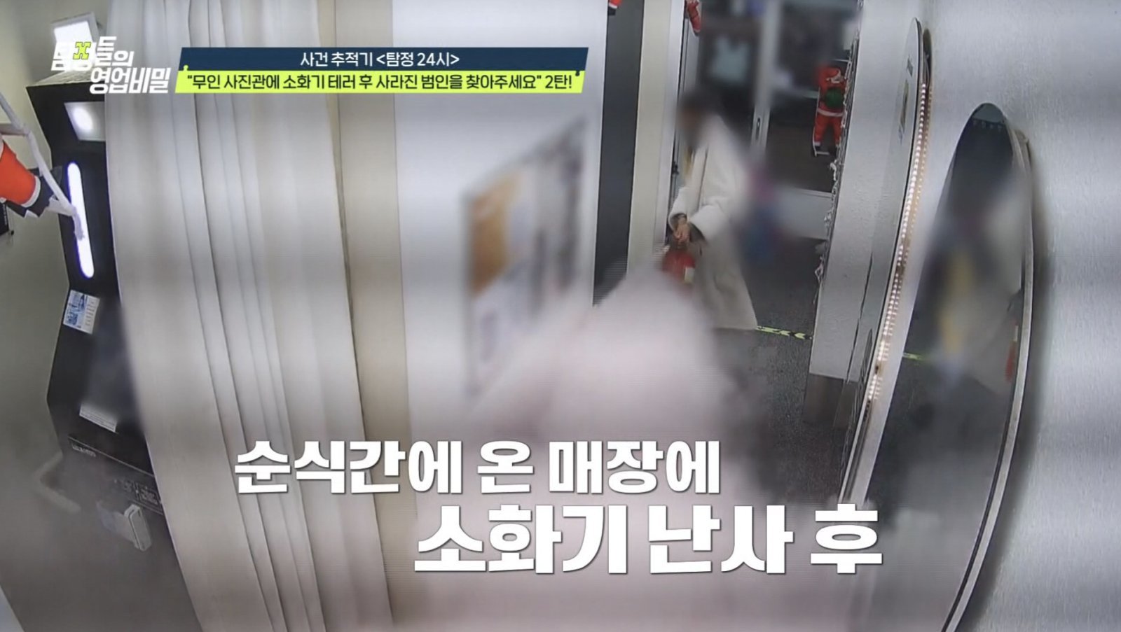 새벽 시간 의뢰인이 운영 중인 무인 사진관에 들어온 범인은 분실 카드를 이용해 95만 원을 결제하고, 매장 곳곳에 소변을 보는 기행까지 저질렀다. 그리고 4일 뒤 다시 찾아온 범인은 매장 전체에 소화기를 난사한 뒤 범행 3분 만에 유유히 사라졌다. 고가의 촬영 기계 파손과 영업 손실을 포함해 피해 금액은 약 7천만 원에 달했다.