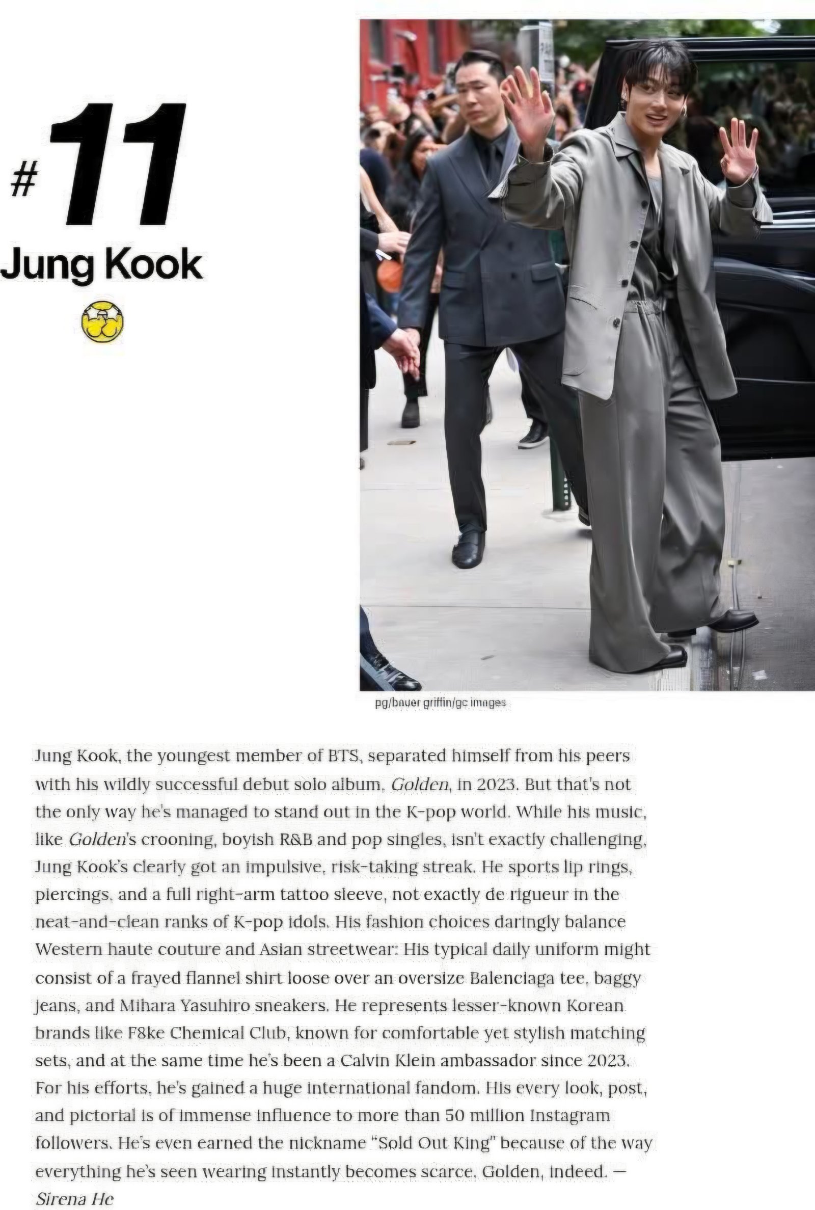 패션 브랜드와의 협업도 선정 배경으로 꼽혔다. 매체는 “2023년부터 캘빈클라인 앰버서더로 활동하며 국제적인 팬덤을 더욱 키웠다”며 “인스타그램 팔로워 5천만 명이 넘는 그의 게시물과 화보는 패션 트렌드에 직접적인 영향을 미친다”고 전했다. 실제로 정국이 착용한 아이템이 빠르게 품절되며 ‘솔드아웃 킹’이라는 별명이 붙은 점도 함께 언급했다.