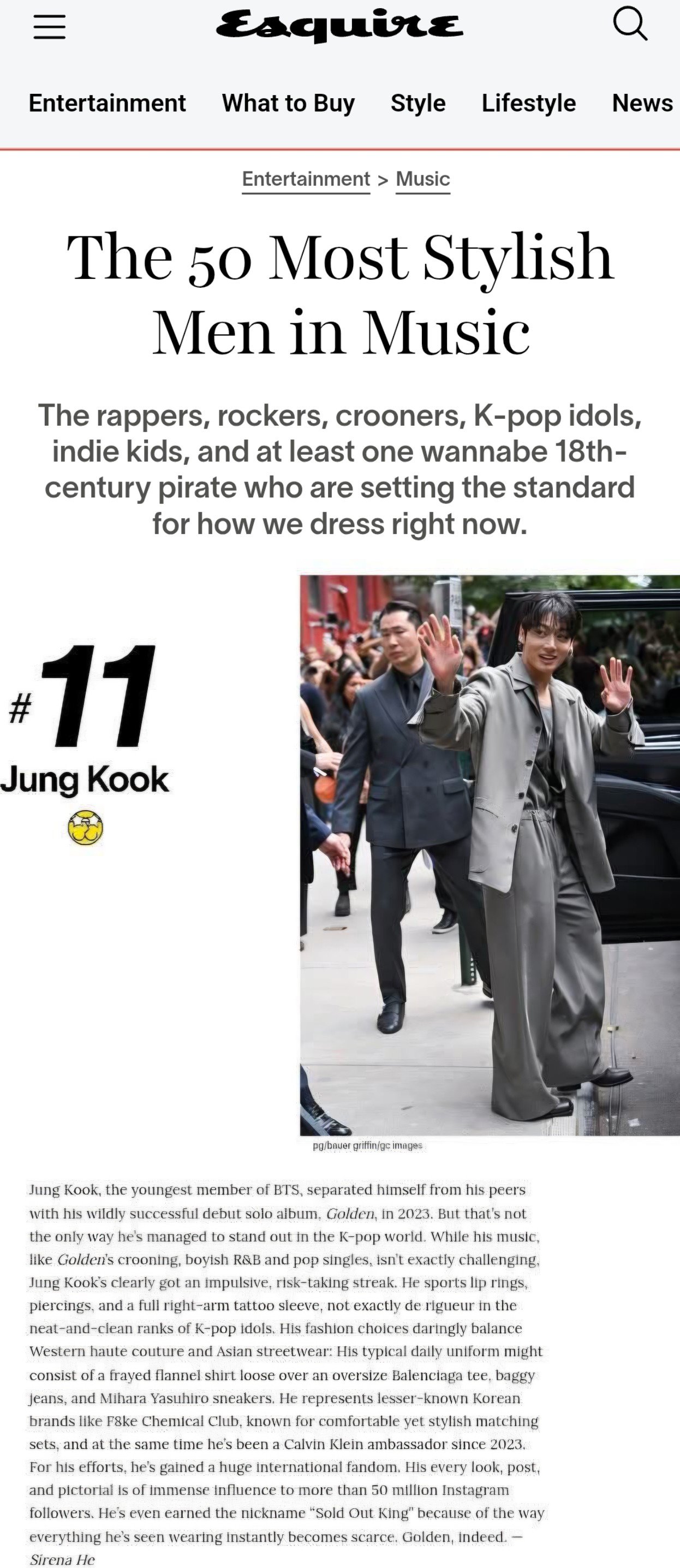 방탄소년단(BTS) 정국은 미국 남성 매거진 ‘에스콰이어’가 선정한 ‘음악계에서 가장 스타일리시한 남성’ 50인 명단에 11위로 포함됐다. 매체는 정국을 두고 2023년 첫 솔로 앨범 ‘GOLDEN’으로 큰 성과를 거두며 동세대 아티스트들과 뚜렷한 차이를 만들어낸 인물로 소개했다.