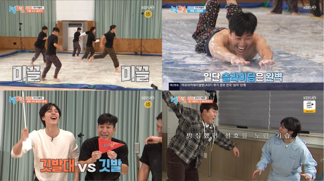 이후 멤버들은 베이스캠프인 선유도중학교로 이동해 새조개 샤부샤부 한 상을 건 저녁 복불복 ‘미끌미끌한 체육대회’에 나섰다. 1라운드 ‘풍선 레슬링’에서는 문세윤과 이준이 접전을 벌였고, 이준이 승점 3점을 가져갔다.