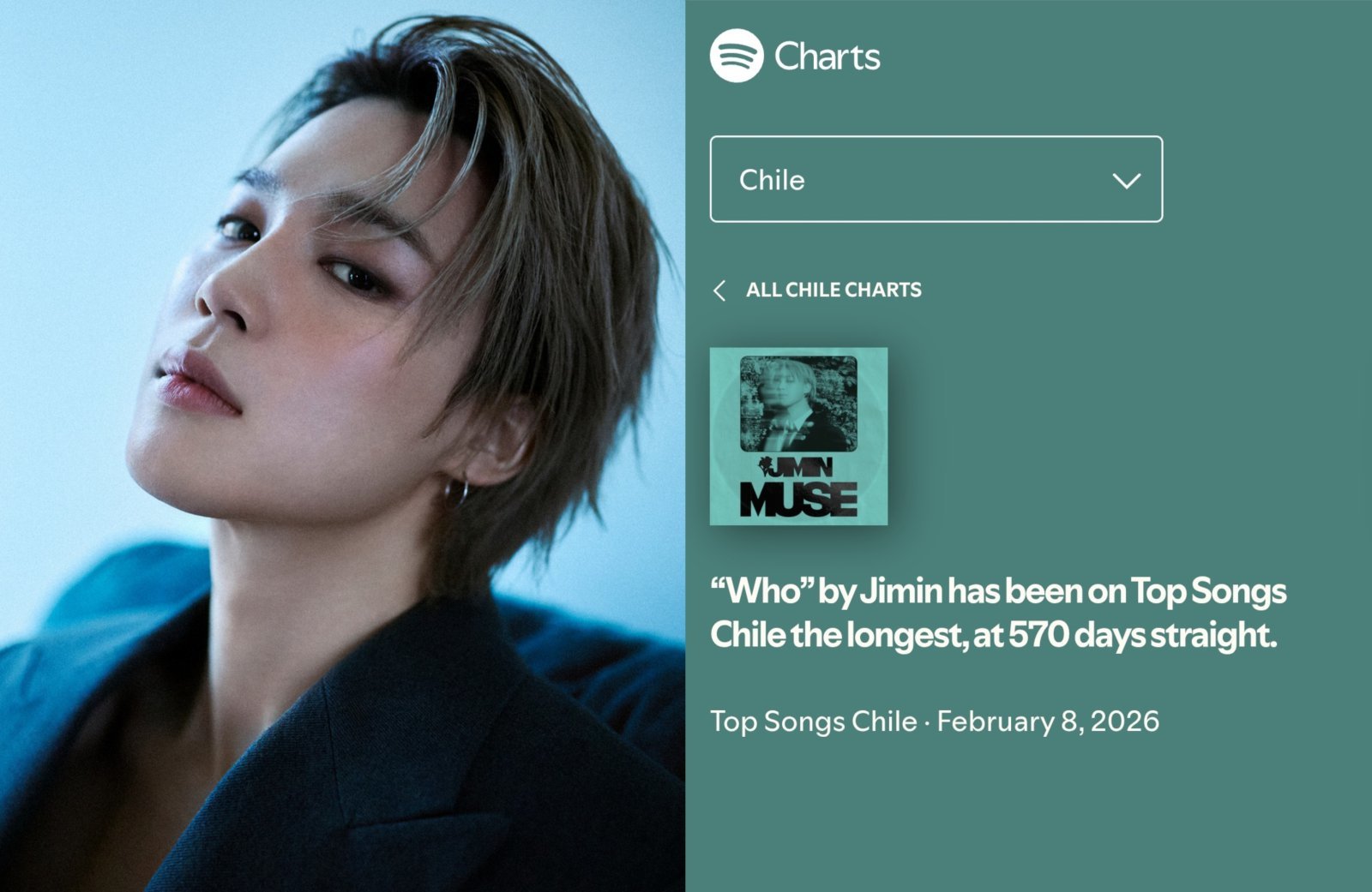 방탄소년단(BTS) 지민이 칠레 음악 시장에서도 강한 영향력을 이어가고 있다. 지민의 솔로 2집 ‘MUSE’ 타이틀곡 ‘Who’는 2월 8일 스포티파이 ‘칠레 데일리 톱송’ 차트에서 3위를 기록하며 570일 연속 차트인에 성공했다. 이는 해당 차트에서 가장 오랫동안 이름을 올린 곡으로, 지민이 직접 보유한 기록을 다시 갈아치운 결과다.