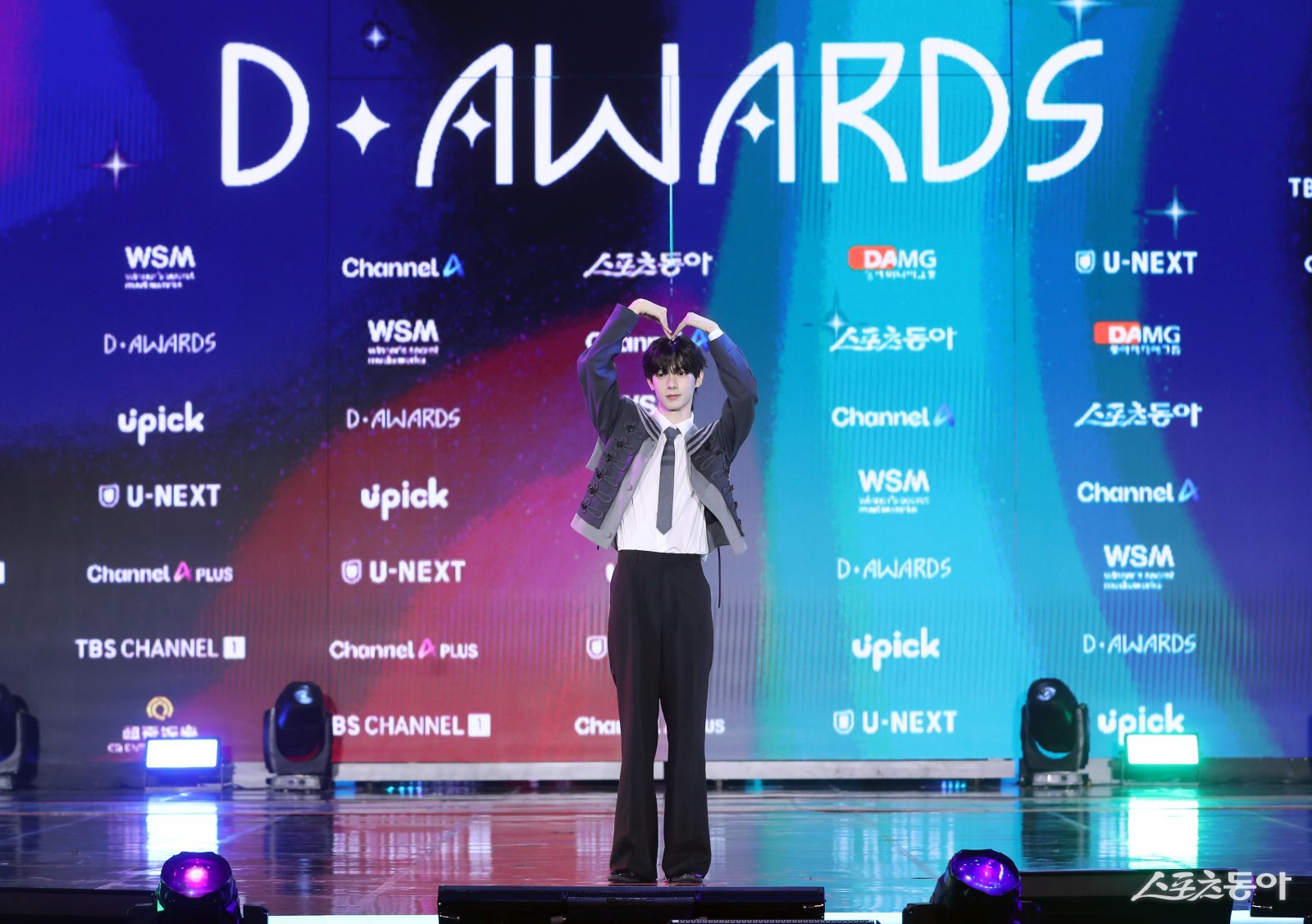 11일 오후 서울 고려대학교 화정체육관에서 열린 ‘제2회 디 어워즈(D AWARDS with upick)’ 포토월 행사에서 최립우가 포토타임을 하고 있다.