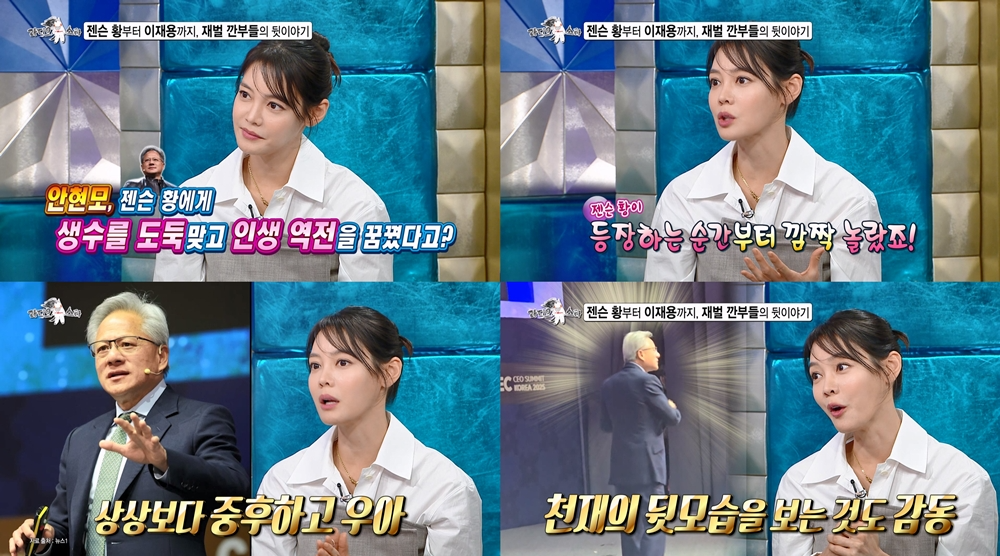MC 김구라가 “젠슨 황에게 생수를 도둑맞고 인생 역전을 꿈꿨다고?”라고 묻자 안현모는 웃으며 현장 이야기를 꺼낸다. 그는 “엔비디아 CEO 젠슨 황이 등장하는 순간부터 깜짝 놀랐다”며 프롬프터 없이 40분 넘게 연설하는 모습을 보고 “천재의 앞모습도 신기했지만 뒷모습도 감동이었다”고 말했다.
