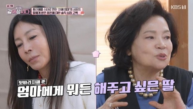 황신혜 어머니는 “딸이 20살인 데뷔 초부터 30살 때까지 매니저 역할을 했다”며 “딸이 돈 좀 쓰라고 해도 못 쓰겠다. 남편 돈은 앉아서 받고 자식 돈은 서서 받는다는 말이 있지 않냐. 나한테 돈 줘도 안 쓴다고 카드를 주는데도 못 쓴다”고 털어놨다.
