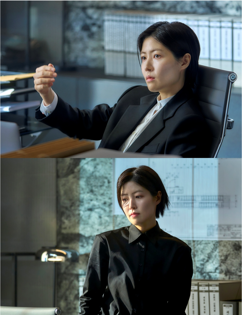 공개된 스틸에서 심은경은 검정 슈트를 입고 무표정한 얼굴로 등장했다. 어둠 속에서 드러난 눈빛은 차갑고 날 선 분위기를 자아낸다. 말 없이도 긴장감을 조성하는 요나의 등장이 극 전개에 어떤 파장을 일으킬지 관심이 모인다.