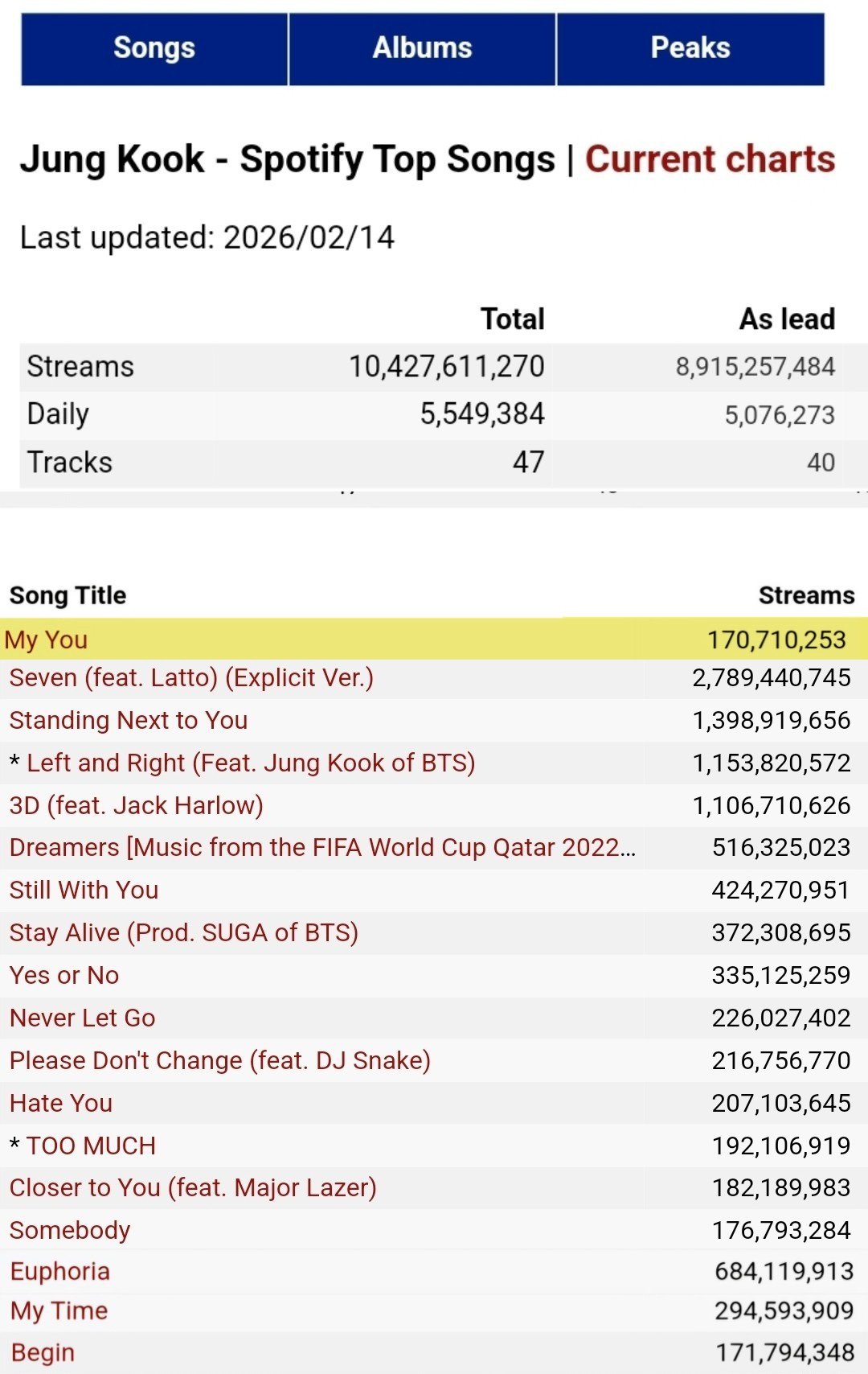 한편 스포티파이에서 정국 개인 프로필은 모든 크레딧 합산 기준 아시아 가수 최단, K-팝 솔로 가수 최초로 104억 스트리밍을 넘어섰다. 솔로 아티스트 정국의 글로벌 영향력을 수치로 확인시켰다.