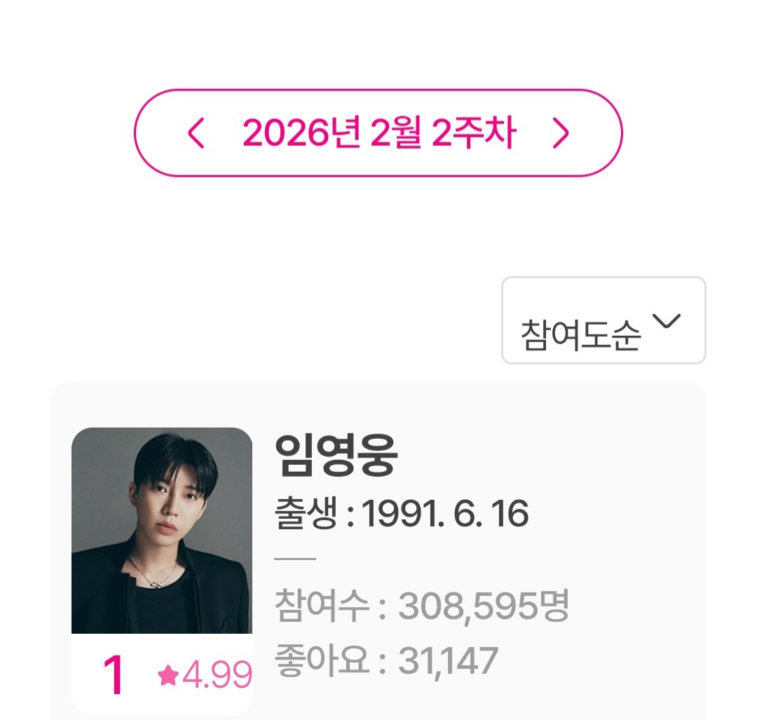 아이돌차트에 따르면 임영웅은 2월 2주차 집계 평점랭킹에서 30만8595표를 얻어 최다 득표를 기록했다. 이로써 2021년 초부터 시작된 1위 기록을 약 4년 11개월 동안 이어가게 됐다. 단 한 차례도 정상 자리를 내주지 않았다는 점에서 의미를 더한다.