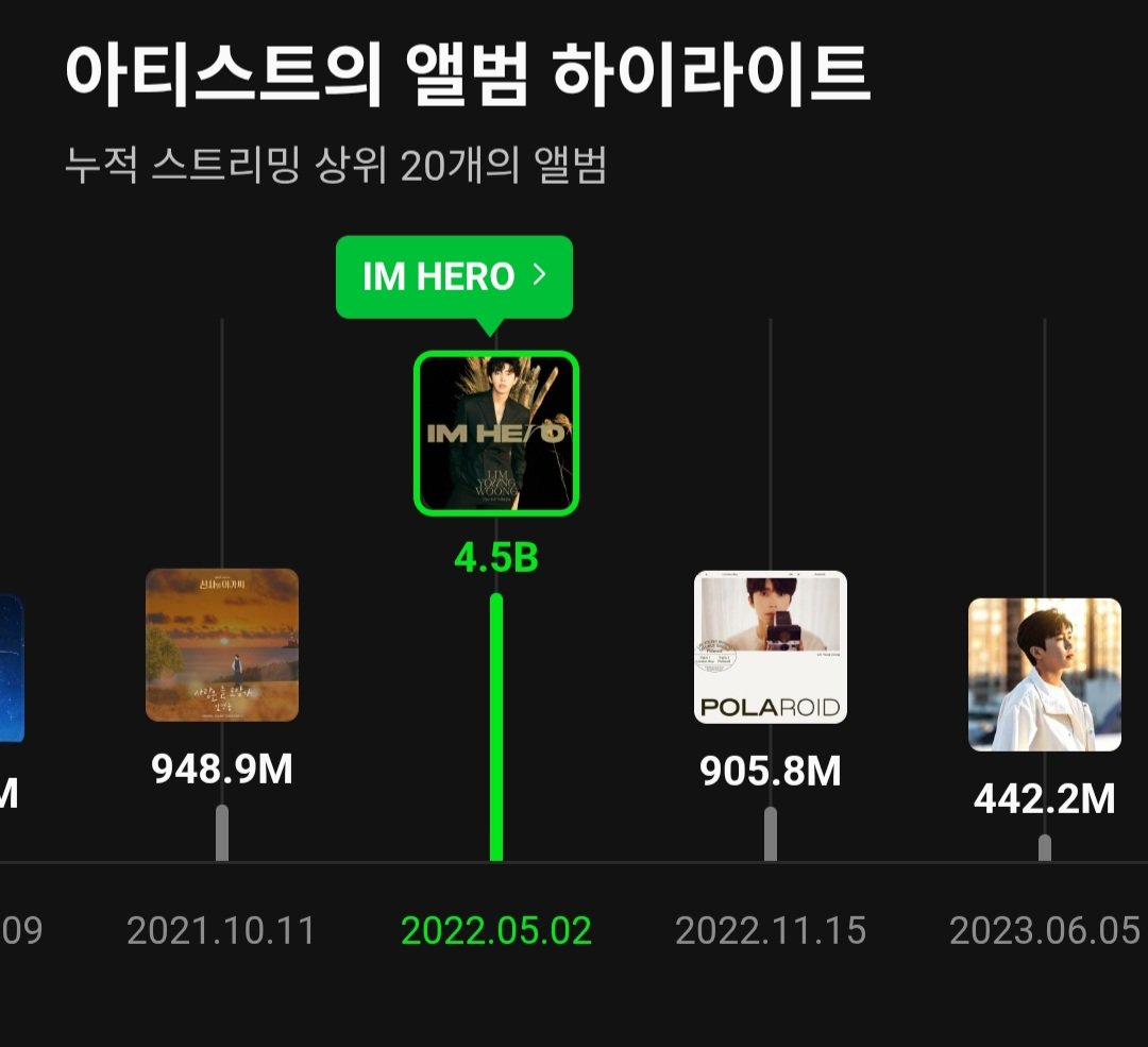가수 임영웅의 정규 1집 ‘IM HERO’가 멜론에서 누적 45억 회 스트리밍을 돌파했다. 2022년 5월 2일 발매된 이 앨범은 2월 17일 기준 45억 회를 넘어섰다. 발매 4년 차에 접어든 앨범이 여전히 높은 재생 수를 기록하고 있다는 점에서 의미가 크다.