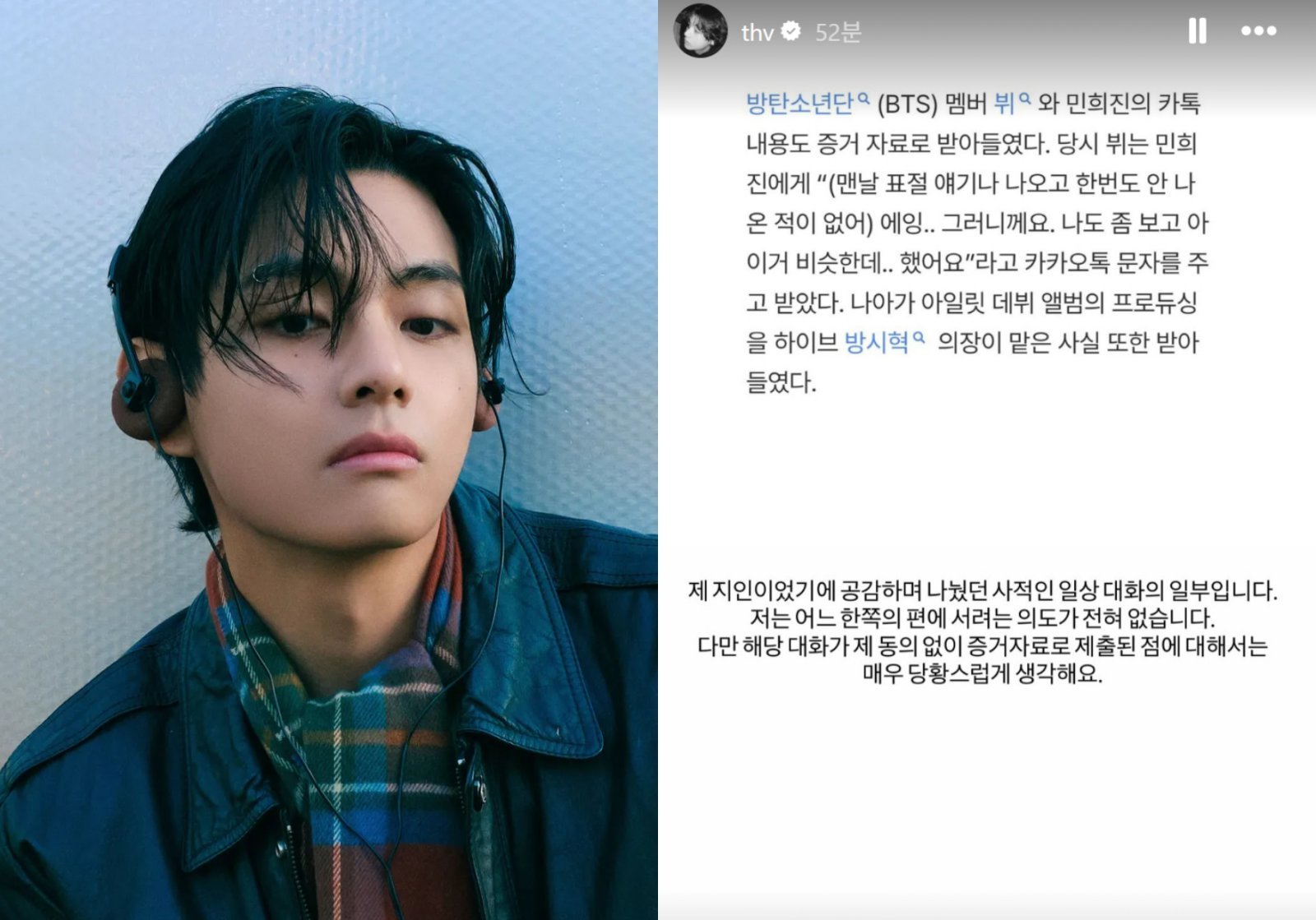 그룹 방탄소년단(BTS)의 멤버 뷔가 민희진 전 어도어 대표와의 사적인 대화 내용이 법정 증거로 활용된 것에 대해 직접 유감을 표했다.