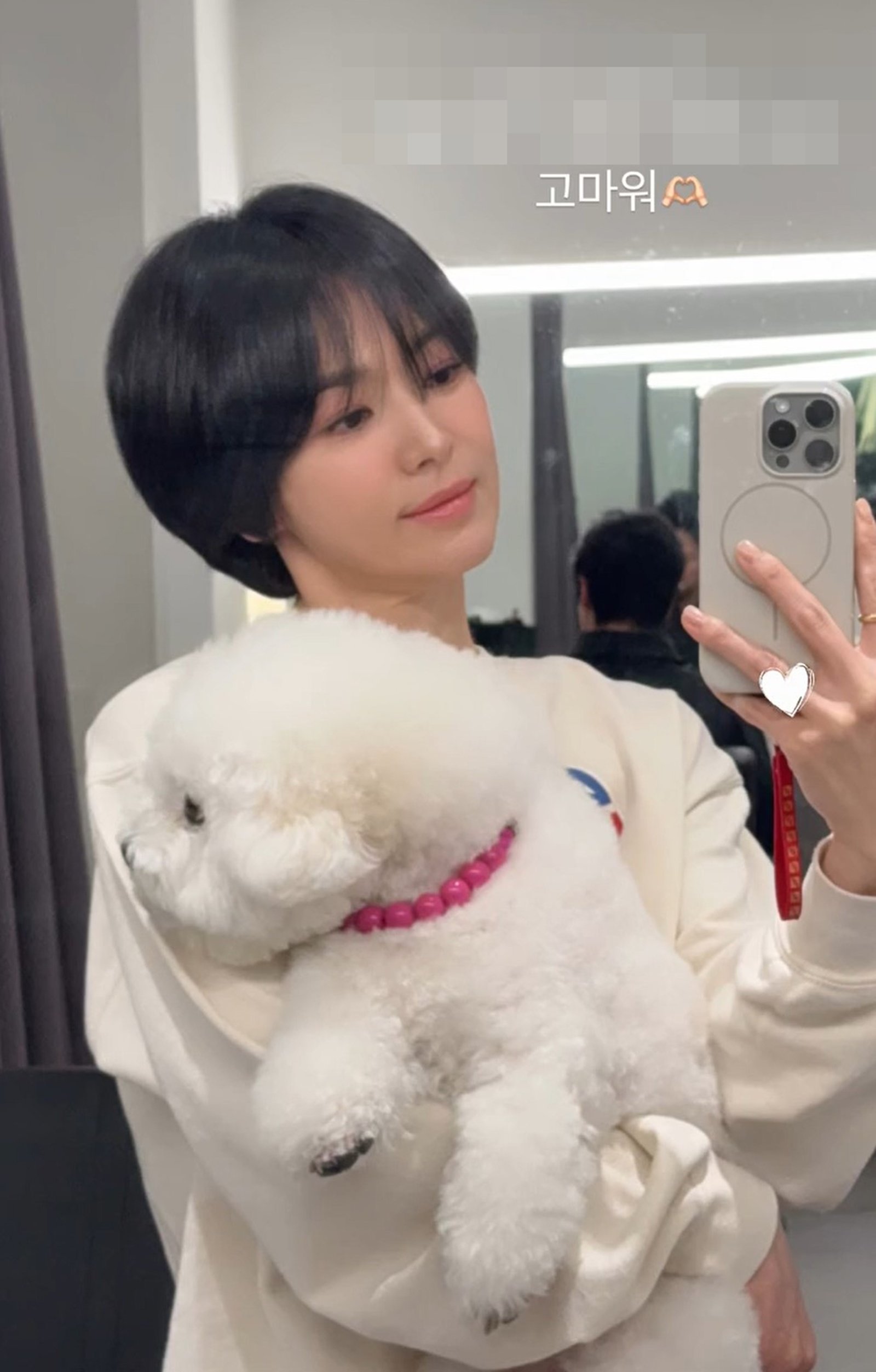 공개된 사진 속 송혜교는 반려견을 품에 안은 채 거울 셀카를 찍고 있다. 파격적인 숏컷 헤어스타일마저 청순하게 소화한 송혜교의 독보적인 비주얼이 시선을 사로잡는다.