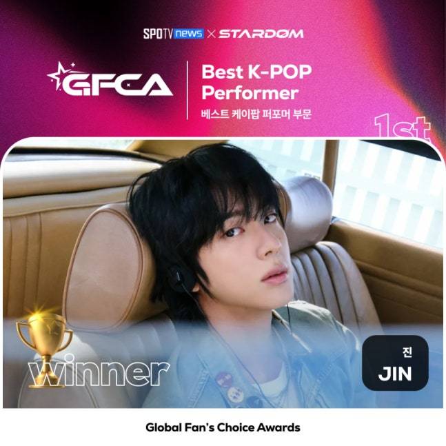 방탄소년단(BTS) 진이 ‘2025 글로벌 팬스 초이스 어워즈(GFCA)’에서 ‘베스트 K-POP 퍼포머’ 부문 1위를 차지했다. 이번 시상식은 스타덤(STARDOM)과 스포티비뉴스가 공동 주최했으며, 수상자는 팬 투표 100%로 결정됐다.