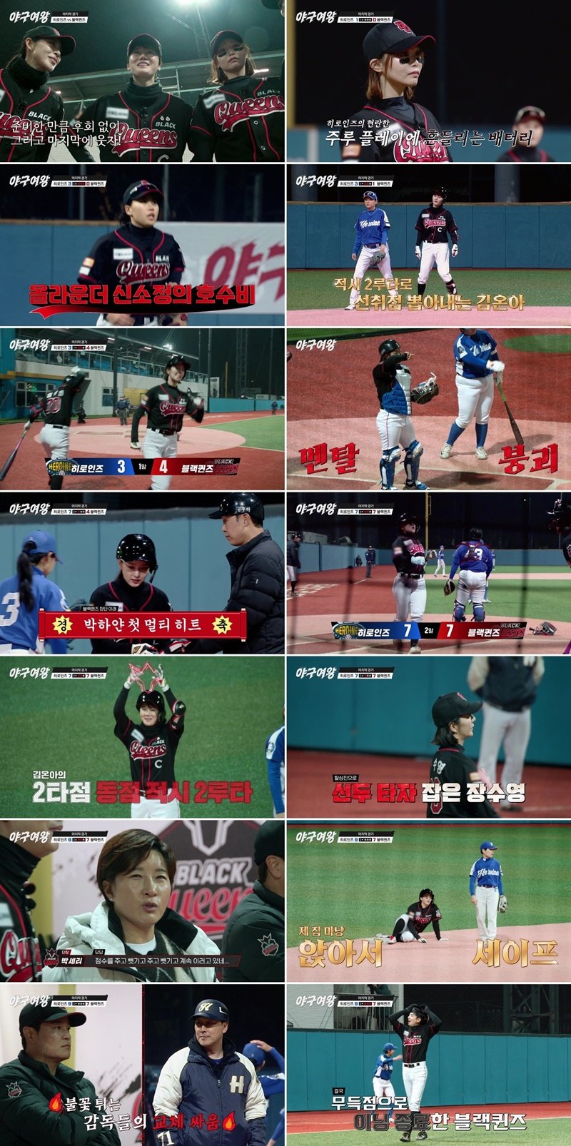 24일 방송된 ‘야구여왕’ 13회에서는 ‘레전드 선출’ 김민지·김보름·김성연·김온아·박보람·박하얀·송아·신소정·신수지·아야카·이수연·장수영·정유인·주수진·최현미가 뭉친 국내 50번째 여자 야구단 블랙퀸즈가 4승 3패 성적 속 최종전에 돌입하는 모습이 그려졌다.
