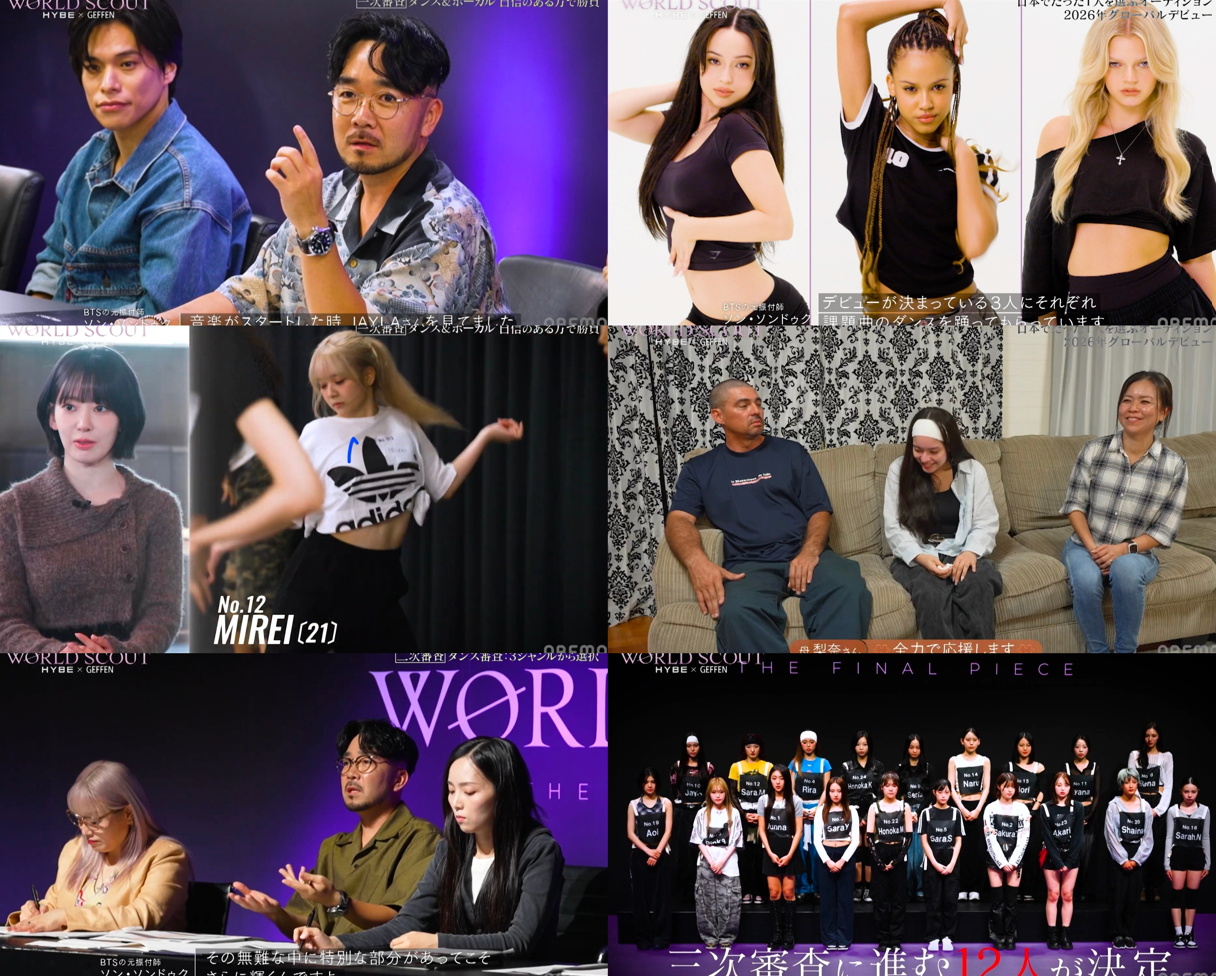 하이브와 게펜레코드가 합작한 글로벌 오디션 ‘월드 스카우트: 더 파이널 피스’(이하 월스파)가 24일 글로벌 OTT ‘아베마’(ABEMA)를 통해 첫 선을 보였다. ‘월스파’는 캣츠아이의 자매 그룹 ‘조각’을 목표로 한 서바이벌 프로그램이다.