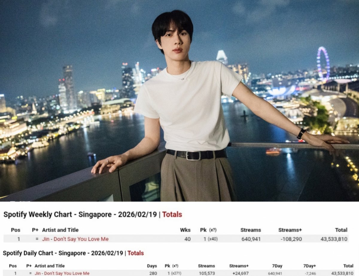 방탄소년단 진의 ‘Don’t Say You Love Me’는 스포티파이 싱가포르 데일리 차트에서 280일 연속 정상에 오르며 장기 집권 기록을 세웠다. 이 곡은 5월 16일 발매된 미니 2집 ‘Echo’의 타이틀곡으로, 2월 19일 기준 데일리 스트리밍 10만5573회를 기록했고 누적 스트리밍은 4353만 회를 넘어섰다.