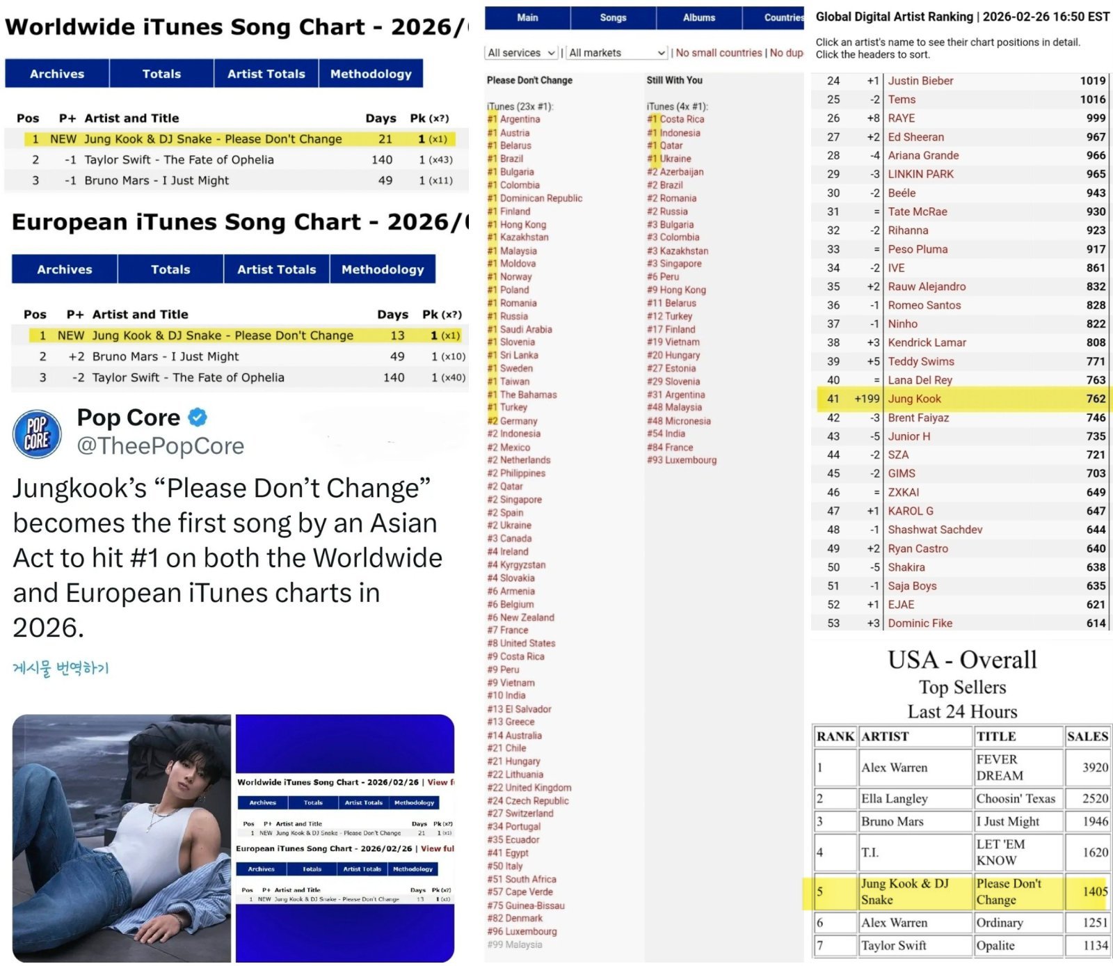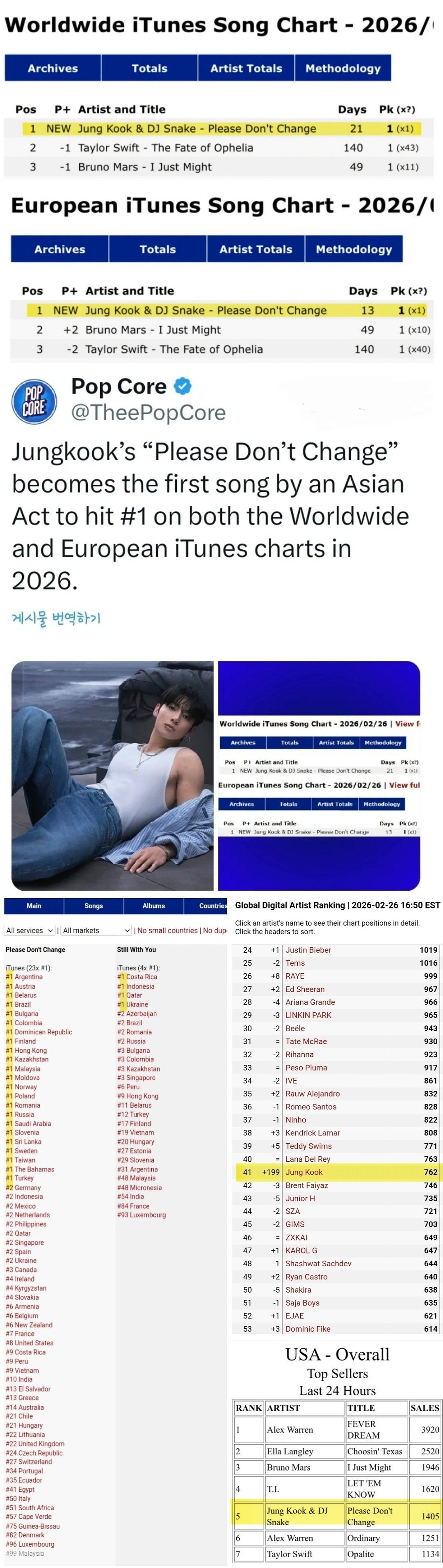 2023년 11월 발매된 정국의 첫 솔로 앨범 ‘GOLDEN’ 수록곡 ‘Please Don’t Change’는 2월 26일 자 월드와이드 및 유러피안 아이튠즈 송 차트에서 나란히 1위로 재진입했다. 발매 2년이 훌쩍 지난 B-사이드 트랙이 정상에 오른 것은 이례적 기록이다.