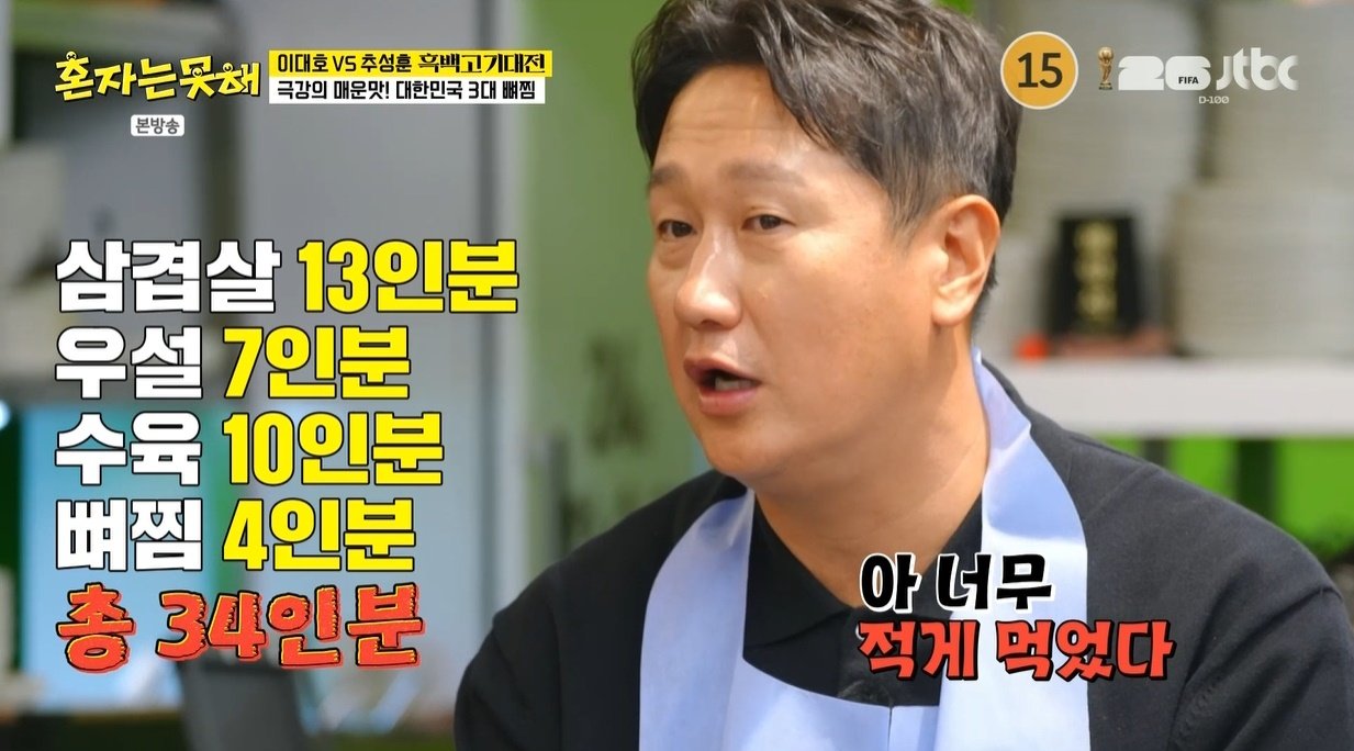 이로써 전현무, 추성훈, 이수지, 이세희, 이대호는 삼겹살 13인분, 우설 7인분, 차돌 수육 10인분, 통껍데기 뼈찜 4인분까지 총 34인분을 격파했다. 그러나 이대호는 “너무 적게 먹었다”며 한 끼를 진득하게 먹었다면 더 먹을 수 있었을 거라는 아쉬움을 보여 웃음을 선사했다.