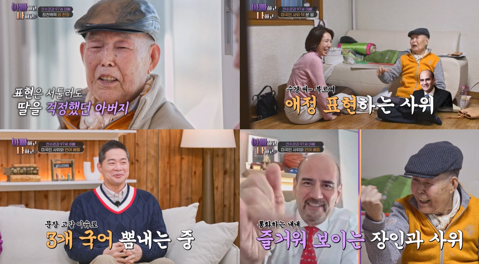 사위를 4년째 만나지 못한 아버지를 위해 전수경은 영상 통화를 준비했다. 통화 전 영어 표현을 연습하던 아버지는 전화가 연결되자 “땡큐 베르마치”라고 외쳤고 이어 “씨 유 순, 오케이, 다이죠부”라며 일본어까지 섞어 말해 웃음을 안겼다. 이를 본 현주엽은 “3개 국어 하신다”며 감탄했다.