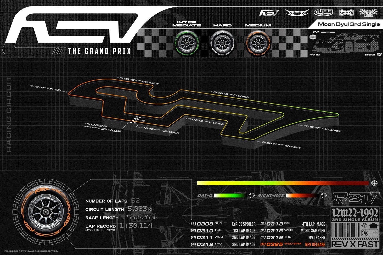 세 번째 싱글 ‘REV’는 ‘엔진의 회전 속도를 올리다’라는 의미를 담고 있다. 문별은 레이싱 콘셉트를 통해 강렬한 질주를 예고, 폭발적인 에너지를 연료로 새로운 음악 레이스를 이어갈 예정이다.