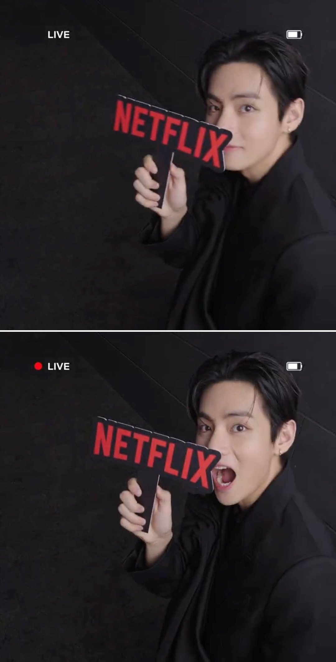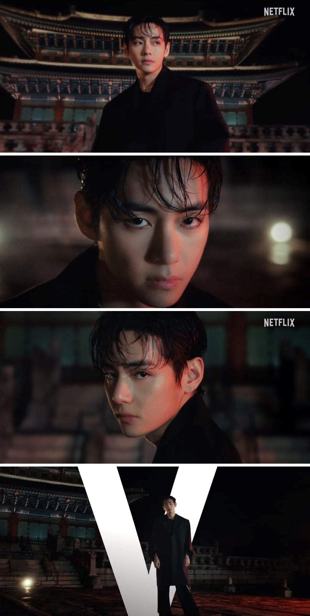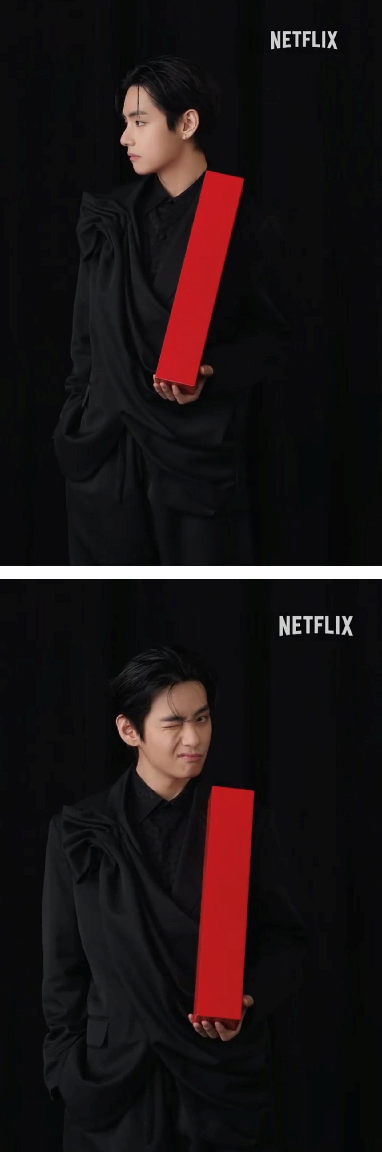 또 다른 영상에서는 분위기가 달라진다. 뷔는 넷플릭스 알파벳 ‘I’를 들고 장난기 가득한 표정을 지으며 유쾌한 매력을 보여줬다. 짧은 영상이지만 귀여움과 냉미남 카리스마가 번갈아 등장하며 다양한 매력을 보여준다.
