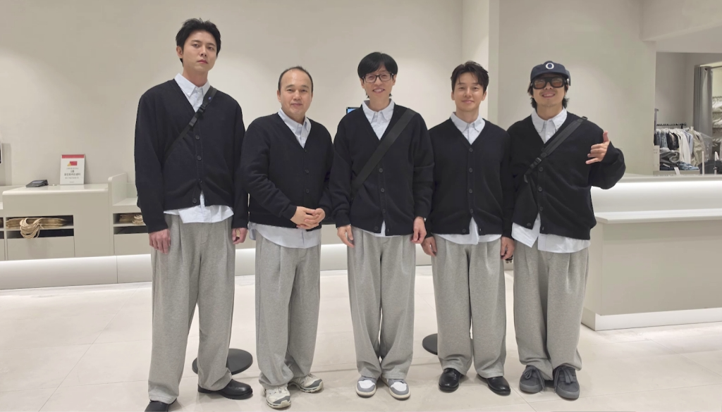 이날 공개된 사진에는 ‘재석 스타일’ 단체복을 맞춰 입은 다섯 남자의 모습이 담긴다. 검은색 가디건과 하늘색 셔츠, 회색 트레이닝 바지까지 유재석 취향이 그대로 반영된 패션이다. 마치 유재석 다섯 명이 나란히 서 있는 듯한 ‘오둥이’ 비주얼이 시선을 끈다.