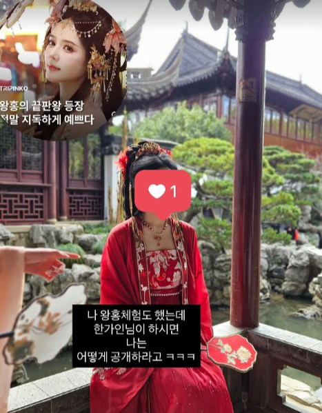 박지윤은 사진 위에 ‘왕홍의 끝판왕 등장’이라는 문구와 함께 최근 화제를 모은 한가인의 왕홍 체험 사진도 함께 올렸다. 한가인의 강렬한 비주얼이 화제를 모은 가운데 박지윤이 유쾌한 반응을 보인 것이다.