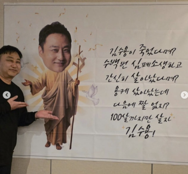 공개된 사진 속 김수용은 재치 있는 문구가 적힌 현수막 앞에서 포즈를 취하고 있다. 현수막에는 “김수용이 죽었다네? 수백 번 심폐 소생하고 간신히 살아났다며? 용케 살아났는데 다음에 짤 없지? 100살까지만 살자”라는 메시지가 담겨 눈길을 끌었다.