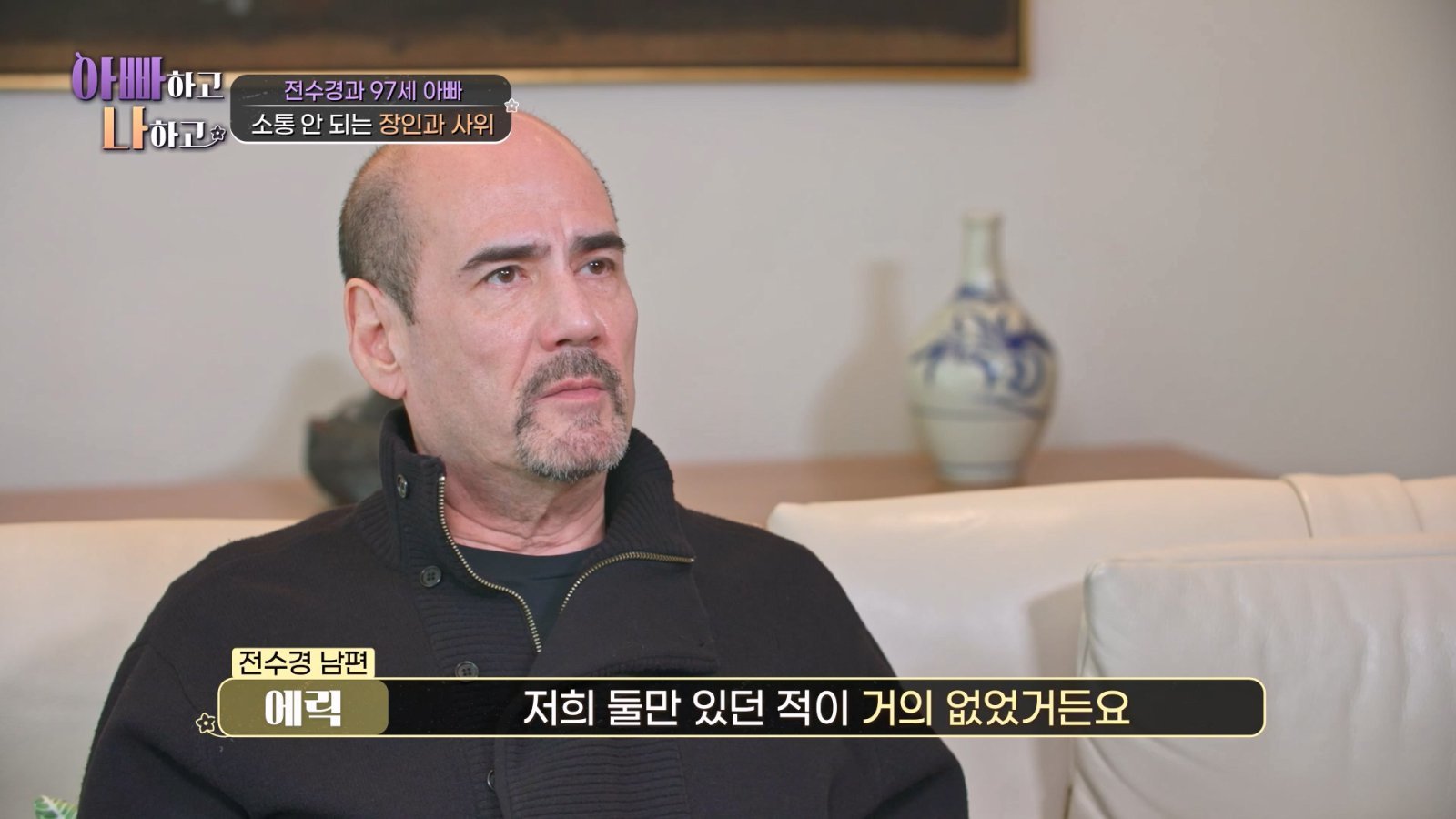하지만 전수경이 자리를 비우자 두 사람 사이에는 어색한 정적이 흐른다. 에릭은 “저 올해 67세예요”라고 말을 걸지만, 알아듣지 못한 전수경 아버지는 미소만 짓는다.