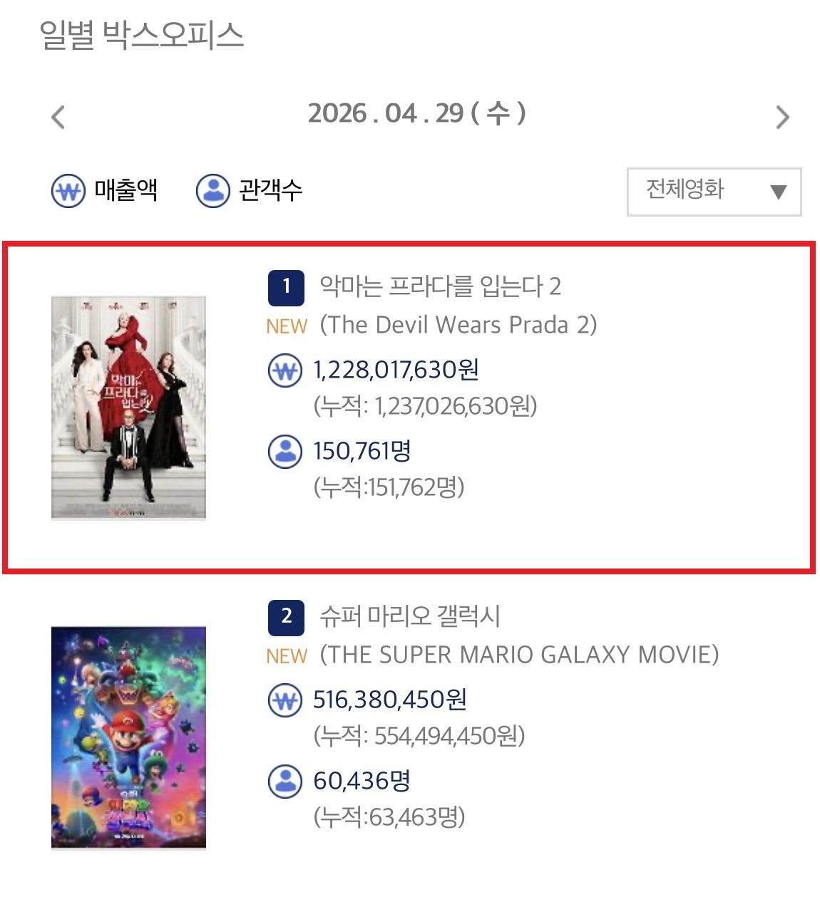 30일 영화관입장권 통합전산망에 따르면 영화 ‘악마는 프라다를 입는다 2’는 개봉일인 29일 하루 동안 15만761명의 관객을 동원했다.