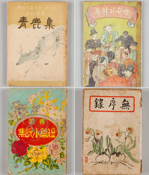 한국 근대문학 거장들의 초판본을 직접 볼 수 있는 전시가 반갑기만 하다. 박목월의 청록집, 안국선의 금수회의록, 이태준의 무서록, 이광수의 춘원단편소설집(왼쪽 상단부터 시계 방향으로). 사진제공|인천문화재단