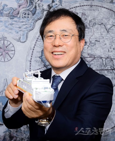 “중국의 작은 유럽 칭다오, UN이 선정한 청정도시 웨이하이를 카페리 타고 다녀오세요!”. 배 여행 예찬론자인 위동항운 전기정 사장이 카페리 모형을 들고 포즈를 취했다. 1990년 설립된 위동항운은 국내 1위의 카페리 여객·화물 운송 회사이다. 김진환 기자 kwangshin00@donga.com
