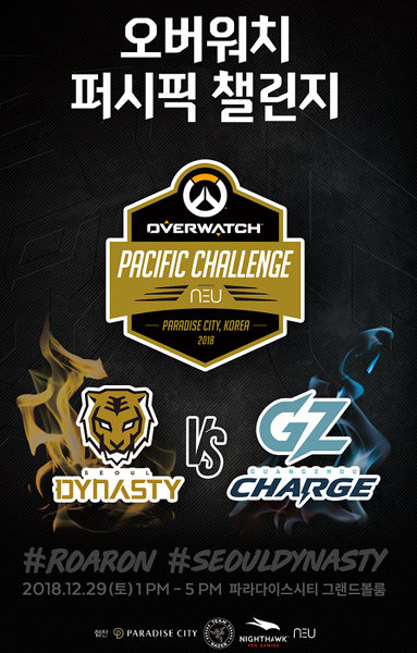 영종도 복합리조트 파라다이스 시티가 29일 그랜드볼룸에서 ‘오버워치 퍼시픽 챌린지’를 개최한다. 2019 시즌 전의 프리시즌 이벤트로, ‘서울 다이너스티’와 ‘광저우 차지’의 공식 친선경기가 열린다. ‘서울 다이너스티’가 2019 시즌을 앞두고 출국 전 팬들과 만나는 비시즌 마지막 이벤트로 기대를 모으고 있다. 경기 전 프라이빗 팬미팅과 에픽하이의 축하공연도 열린다.