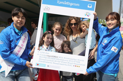 외국인들의 방한 초기, 한국에 대한 호감을 높인 것으로 평가받는 대학생 미소국가대표들이 외국인 여행자들과 기념촬영을 하고 있다. 사진제공|재단법인 한국방문위원회
