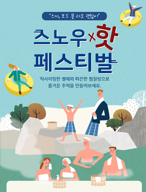 우선 눈썰매장과 옐로우 슬로프를 ‘익사이팅 썰매존’으로 조성해 플라스틱 썰매부터 스노우래프팅, 추억의 비료포대 썰매까지 즐길 수 있다. 운영시간은 오전 9시부터 오후 5시까지다. 피크아일랜드 4층 찜질방에서는 오전 10시부터 황토숯, 피톤치드, 맥반석 등 다양한 테마를 체험할 수 있다. 대인 2만5000원, 소인(만 36개월 이상~만 12세 이하) 2만원이며, 눈썰매장 매표소에서 해당 표를 구입할 수 있다.