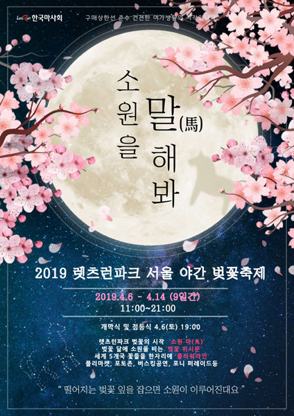 렛츠런파크 서울이 6일부터 시작하는 벚꽃축제 ‘소원을 말(馬)해봐!’를 기념해 7일 무료입장을 시행한다. 벚꽃축제는 ‘소원이 이루어지는 곳’이란 콘셉트로 진행되며 5m 높이의 초대형 위시문 포토존과 각종 소원 이벤트를 진행한다. 렛츠런파크 서울에서만 볼 수 있는 포니 퍼레이드와 경마 경주까지 즐길 수 있다. 7일만 경마관람대가 무료이며 경마 관람지역을 제외한 벚꽃로는 축제 기간인 6∼14일 오전 11시부터 오후 9시까지 무료로 즐길 수 있다.