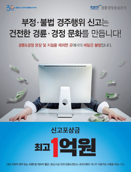 불법 사설 경주 신고 포상금을 기존 최고 5000만 원에서 1억 원으로 대폭 높였다. 국민체육진흥공단 경륜경정총괄본부는 신고 포상금 제도를 개편해 단속 금액과 단속인원, 제보 내용을 기준으로 합산해 사법기관으로 송치된 인원과 금액이 많을수록 많은 포상금을 받도록 했다. 또한 신고를 많이 할수록 가산금을 지급하는 제도를 신설, 2회 신고부터 최대 5회까지 포상금의 10%씩 가산해 인센티브를 부여한다. 불법 경륜경정 온라인 사이트 증가에 대응하는 신고포상금 제도도 개선됐다. 기존에는 신고한 사이트가 방송통신심의위원회의 결정에 따라 폐쇄되면 1건당 5만 원씩 지급하고 연간 최대 100만 원을 받을 수 있었으나, 올해부터 1건당 10만 원이고 연간 지급한도도 폐지했다. 불법 경륜경정 신고는 불법신고센터나 이메일로 가능하고, 신고자 신원은 비밀로 보호된다.