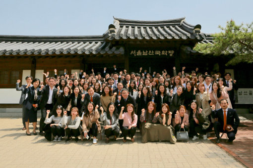 서울 남산골한옥마을에서 개최된 창립 1주년 기념행사에서 서울관광재단 임직원이 함께 단체사진을 촬영하고 있다. 사진제공|서울관광재단
