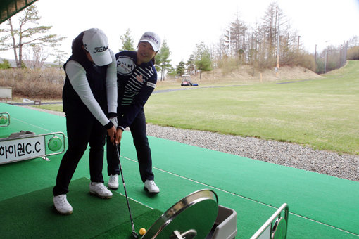 29일 하이원C.C 드라이빙레인지에서 박보미 프로가 임시온(갈래초 6학년)학생에게 원포인트 레슨을 하고 있다. 사진제공|강원랜드