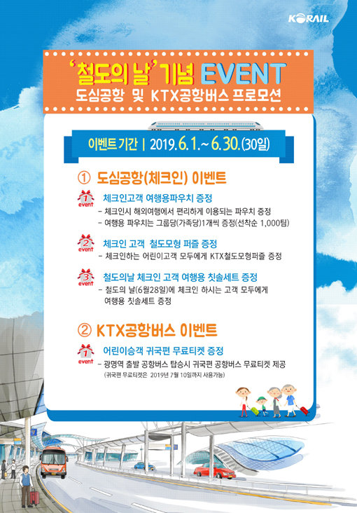 우선 어린이 고객이 광명역에서 인천공항으로 가는 KTX공항버스를 이용하면 귀국 시 이용할 수 있는 어린이 승차권을 무료로 제공한다. 또한 도심공항터미널에서 체크인 하면 선착순으로 여행용 파우치를 제공하고 모든 어린이 고객에게는 철도모형 퍼즐을 추가로 증정한다. 철도의 날인 6월 28일에는 모든 체크인 고객에게 여행용칫솔세트도 증정한다.