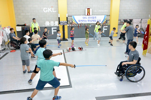 그랜드코리아레저(이하 GKL, 사장 유태열)가 30일 경기도 남양주 GKL 휠체어펜싱팀 훈련장에서 ‘어린이 펜싱 체험교실’을 개최했다.