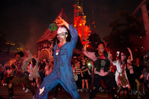 롯데월드의 가을시즌 할로윈 축제에서 좀비 특수분장을 하고 춤을 추는 연기자들. 사진제공|롯데월드