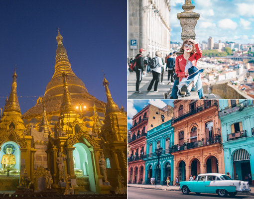 미얀마 양곤의 쉐다곤 파고다, 오랜 역사의 고풍스런 분위기가 매력적인 포르투갈 포르투, 카리브해의 낭만이 담긴 쿠바 하바나 거리(왼쪽부터 시계 방향으로). 이번 가을과 겨울 해외여행의 새로운 명소로 뜨고 있는 핫 플레이스들이다. 사진제공|내일투어