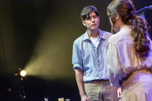 준이치 역을 맡은 김규종(왼쪽)이 마리코(강지혜 분)를 향해 격한 감정을 쏟아내고 있다. 마주보고 있지만 극 중에서 두 사람은 이역만리 떨어져 있는 상황이다. 사진제공|벨라뮤즈
