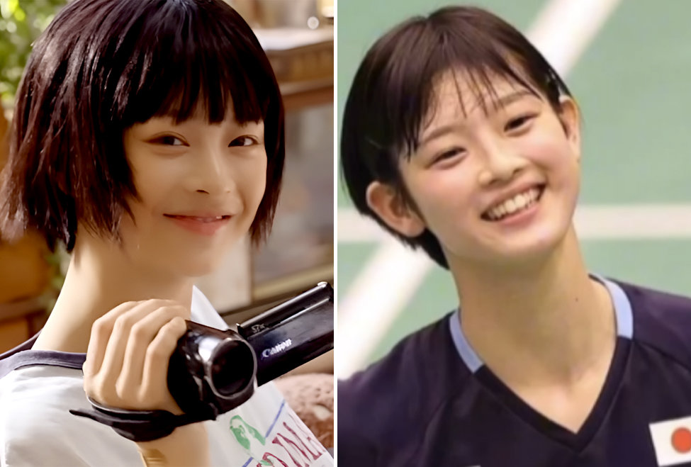 일본의 20세 배드민턴 선수 타구치 마야가 뉴진스 하니를 닮은 외모로 한국 온라인상에서 화제다. 사진=인스타그램 왼쪽은 뉴진스 하니, 오른쪽은 타구치 마야. 사진=뉴진스 유튜브, @maya_tguchifan,