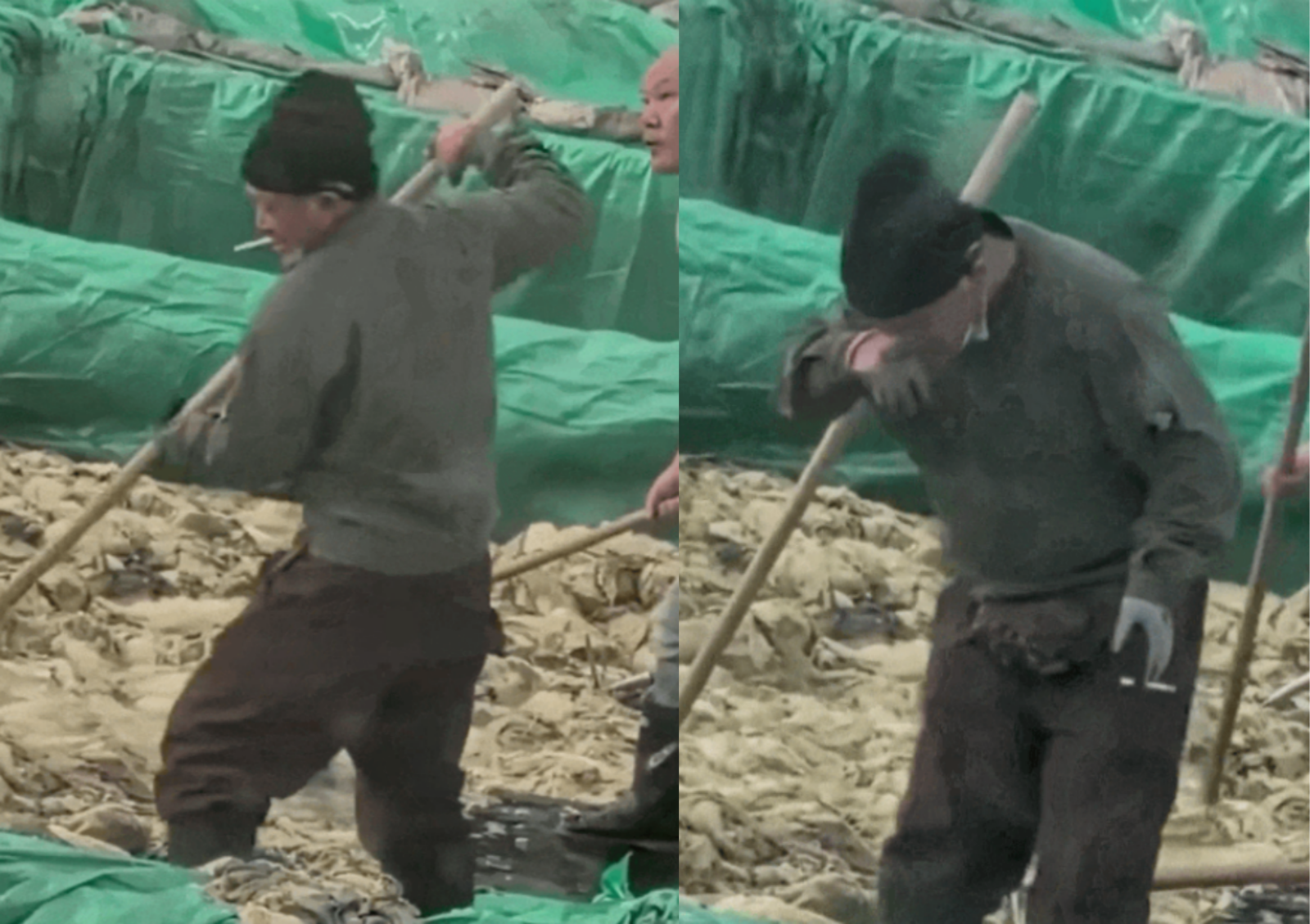 절임배추 작업자가 작업 중 담배를 피우고 침을 뱉는 모습. ⓒ 뉴시스